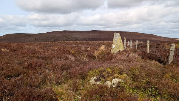 There is one other way, and that is to take the sketchy ridge heading WSW and then branching left for the last mile to the second hill. It’s boggy, allegedly, but there had been no rain for ages, so it couldn’t be that bad. Indeed it wasn’t. I started off along a path with a fence on my right but it soon became clear that a better path ran on the other side – and best of all, solid railway sleepers led me over the roughest stuff.